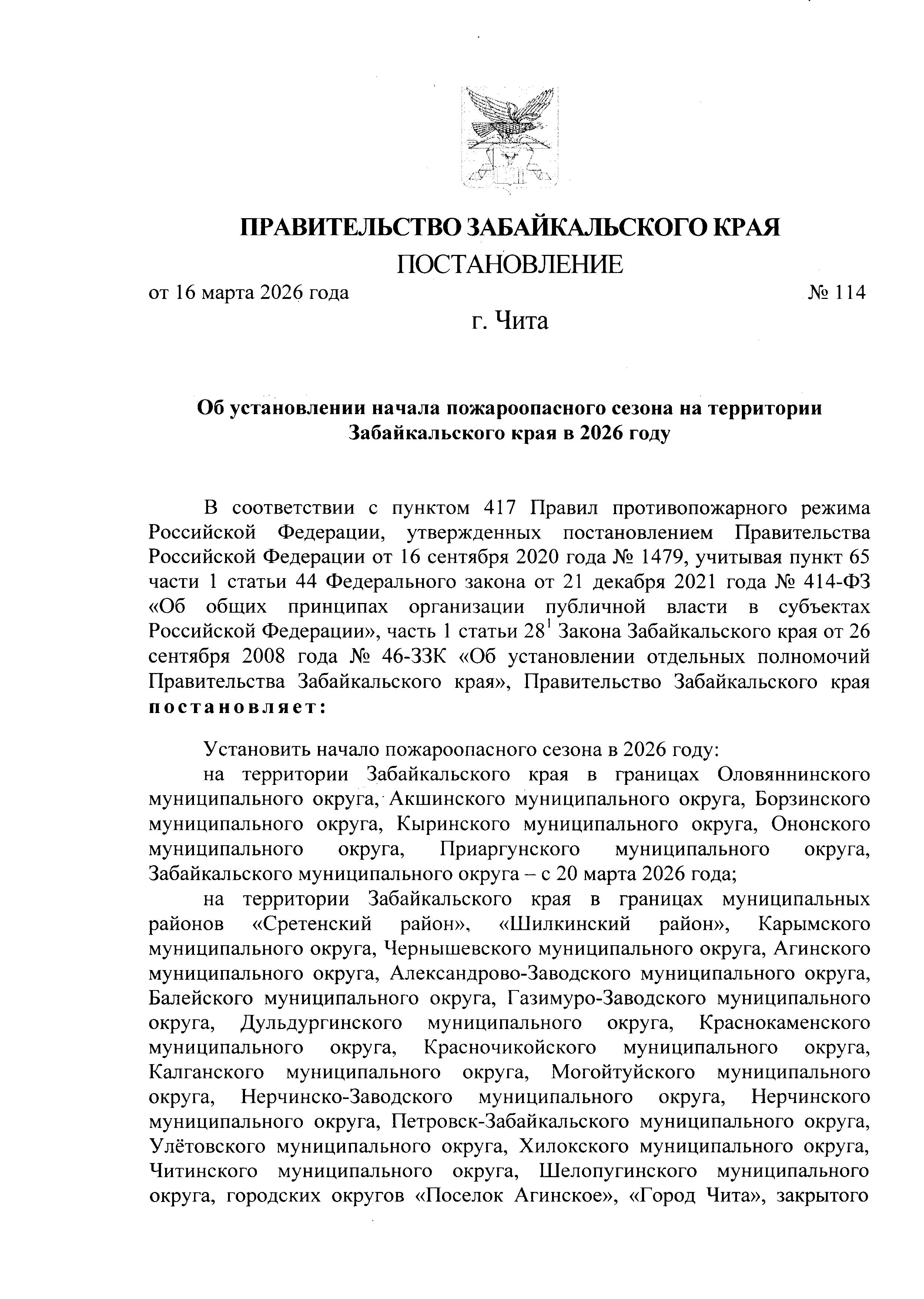 На территории Забайкальского края установлен пожароопасный сезон