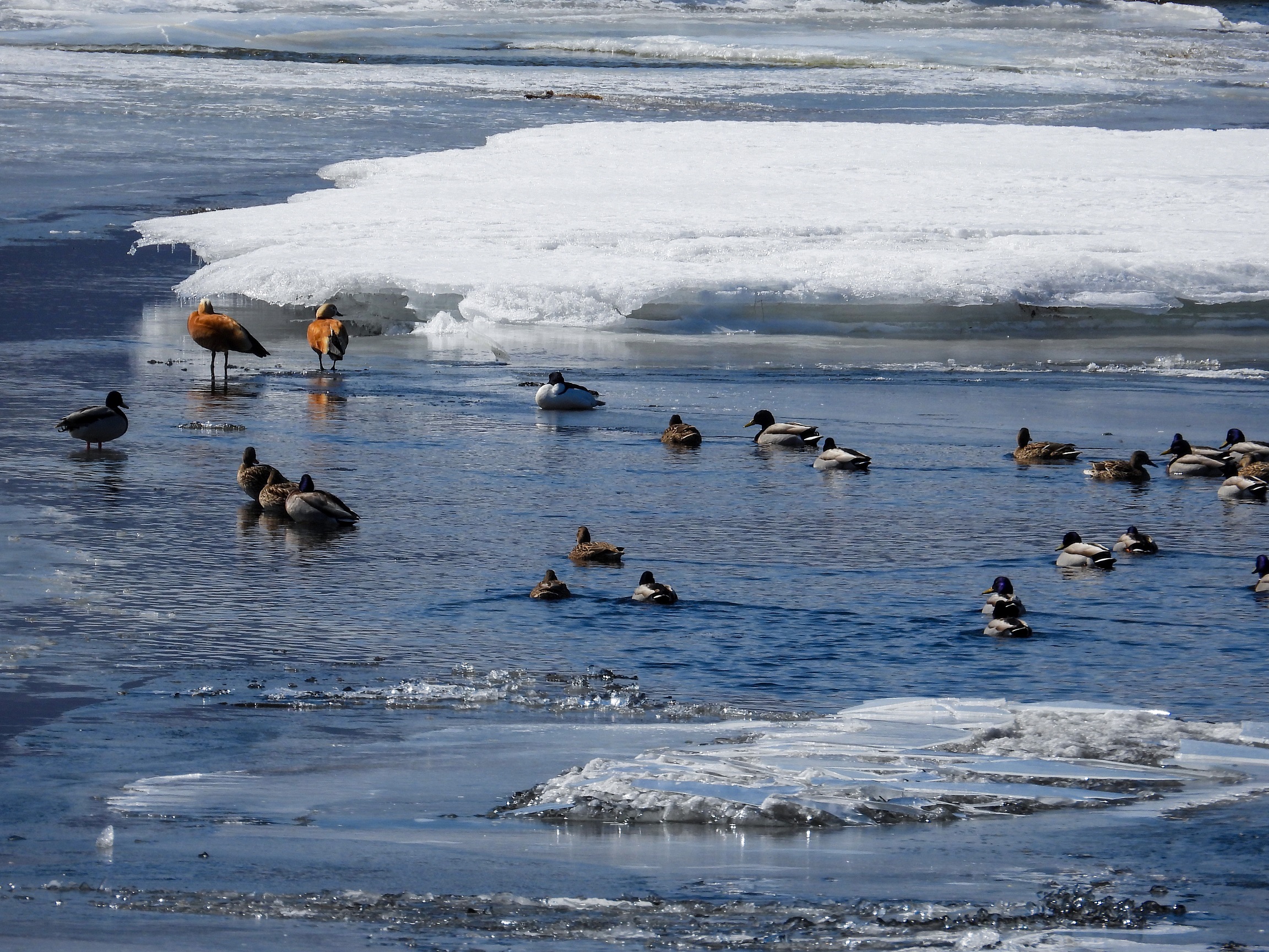 Из уток первыми отмечены кряква (Anas platyrhynchos) и огарь (Tadorna ferruginea). Кряква — родоначальница большинства пород домашних уток. Весной кряквы появляются парами или небольшими группами, первыми из уток. Гнездо устраивают не только среди тростника или в кочкарнике, но нередко вдали от воды — в лесу, на лугах, а также в дуплах и старых гнёздах сорок и ворон. Селезни в гнездовых заботах обычно не участвуют: в середине инкубации они улетают на линьку. Птенцы становятся самостоятельными на восьмой неделе жизни.