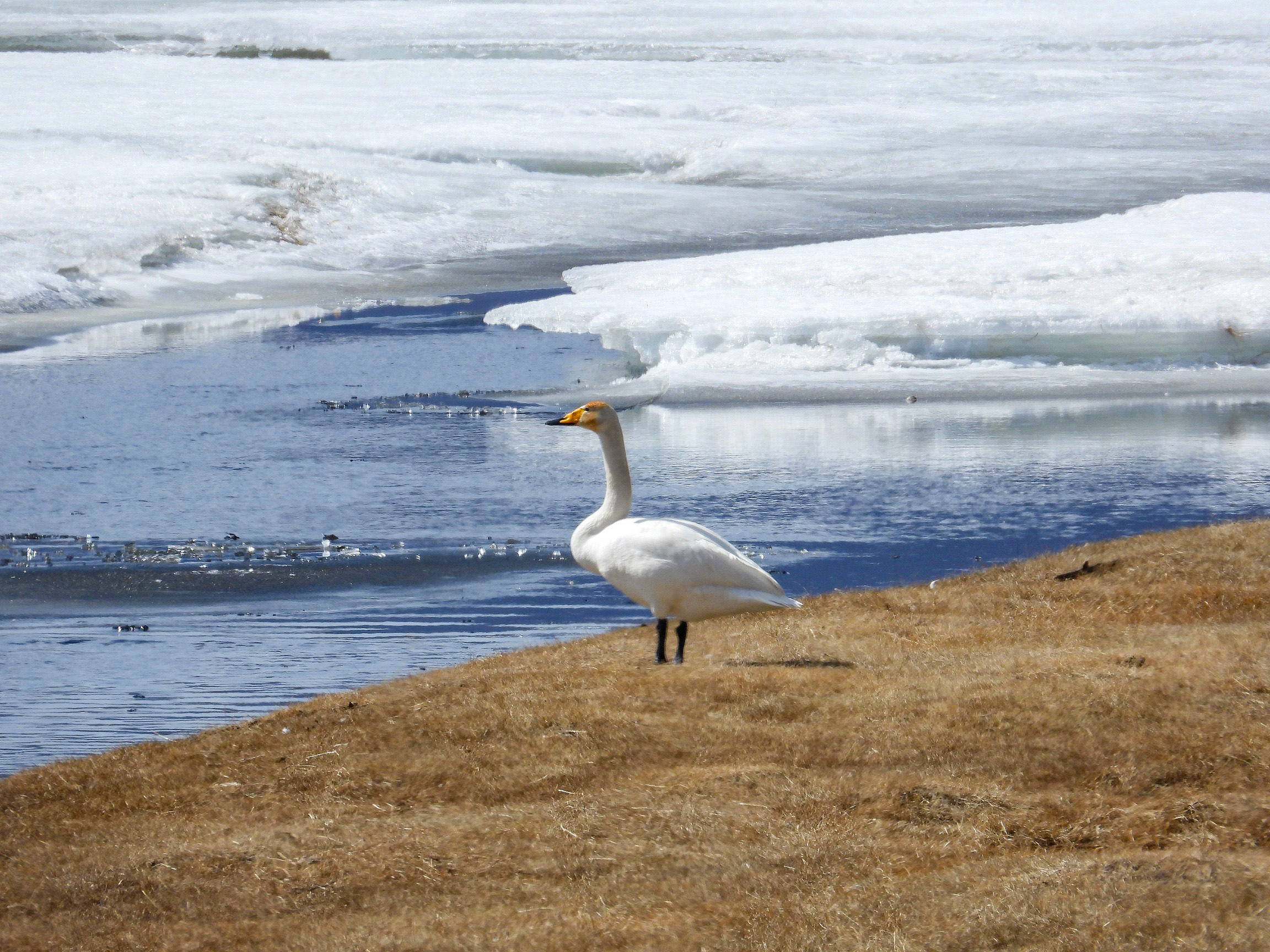 Чуть ранее, вместе с журавлями, в охранной зоне замечен и лебедь-кликун (Cygnus cygnus). Это один из крупнейших водоплавающих. Кликуны прилетают с зимовок раньше всех других водоплавающих птиц — часто ещё при полном снежном покрове или по первым проталинам. Пары у них постоянны, а гнездовья используются из года в год. Гнездо очень массивное, может превышать метр в высоту. В кладке 5–7 (до 9) яиц размером 98–126×65–78 мм. Изначально они сливочно-белые, но быстро пачкаются до грязно-охристых. Насиживает самка 33–40 дней, самец охраняет территорию и способен нанести хищнику (вплоть до лисицы) мощный удар сгибом крыла.